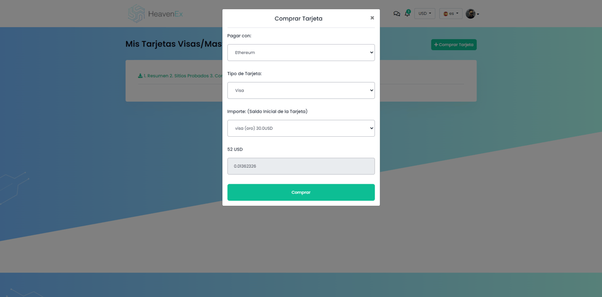 Formulario para la compra de tarjetas Visa y Mastercard prepagadas en la exchange HeavenEx.