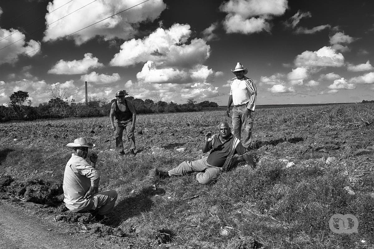 Los pobladores del batey, antes trabajadores del central y ahora agricultores, descansaban bajo el sol. Los campos que rodean los bateyes suelen estar sembrados siempre con caña de azúcar. La cosecha implica que sean quemados frecuentemente, un proceso que empobrece los suelos. El central «Diez de Octubre» tenía 369 caballerías de tierras propias.