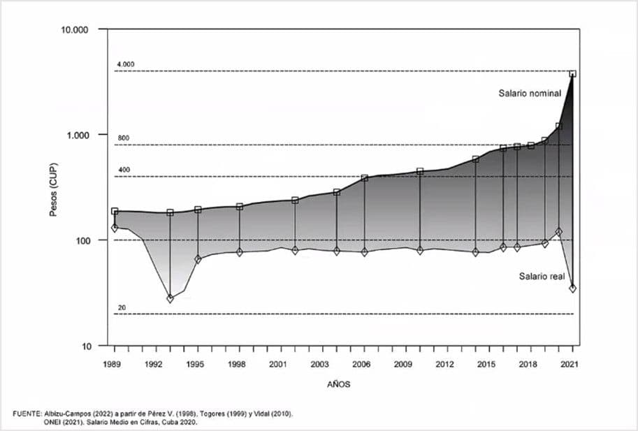 Según refirió el especialista, todos los incrementos nominales en el salario, implementados desde 1989 hasta 2021, fueron «devorados» por el alza de los precios; lo cual indica la disminución del salario real, entendido como el poder de compra. Si bien en el Período Especial se registraron niveles mínimos históricos del indicador, en 2021 las cifras no distan mucho del récord.