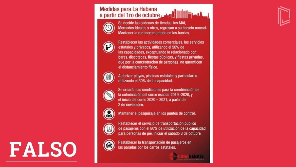 Circuló en estados y grupos de WhatsApp una imagen que supuestamente contenía los aspectos para la flexibilización de las medidas en La Habana, a partir del 1 de octubre de 2021, publicados por Cubadebate.