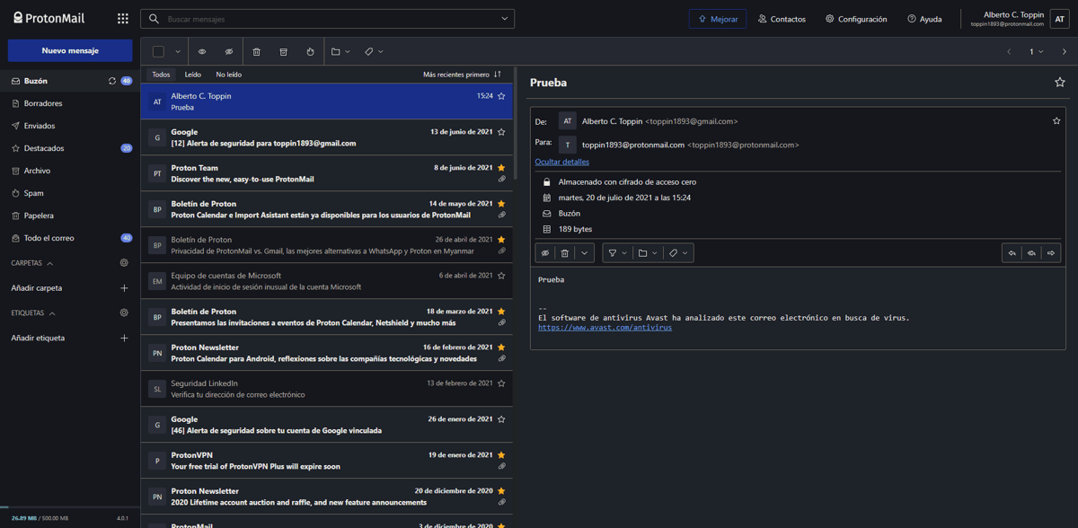 Cada cuenta gratuita de ProtonMail dispone de 500 megabytes de almacenamiento para el correo y permite enviar hasta 150 mensajes diarios, usar una VPN (ProtonVPN) y un calendario cifrado (Proton Calendar). El almacenamiento en la nube (Proton Drive) aún está en fase beta y se reserva a los usuarios de pago.