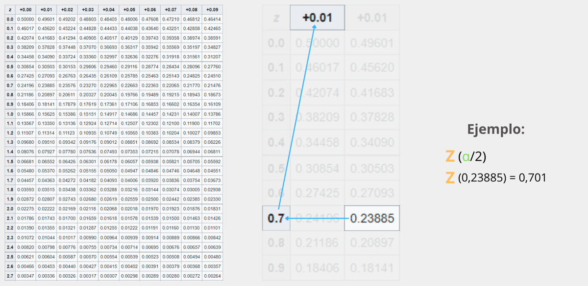Podemos utilizar la tabla de acumulado complementario (tabla matemática que se utiliza para mostrar la probabilidad de que un suceso estadístico sea mayor que Z) y unir los valores de la primera columna con la primera fila para formar el valor de Z como muestra el gráfico.