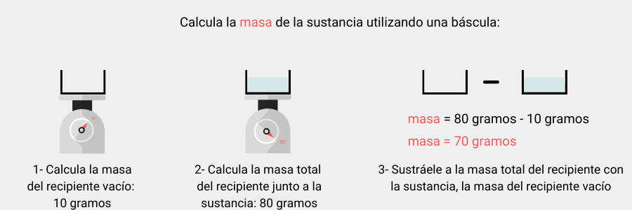 La masa la podemos calcular también empleando una báscula. Tengamos en cuenta que, antes de calcular la masa de la sustancia, debemos calcular la del recipiente en el que la colocaremos. Para luego restarle la masa del recipiente.