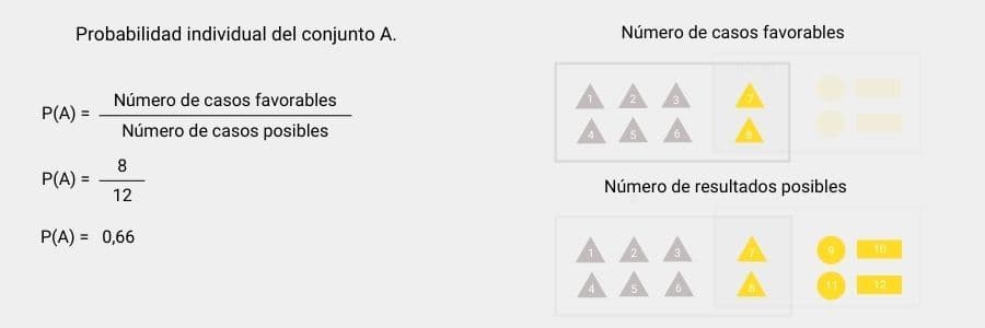 En este cálculo de probabilidades los resultados siempre oscilarán entre las cifras 0 y 1, en el que 0 es la menor probabilidad de que algo ocurra y 1 la máxima. Es por ello que en el caso analizado la probabilidad de que al elegir una figura sea un triángulo o una figura amarilla es total, no existe probabilidad de que ocurra algo diferente.