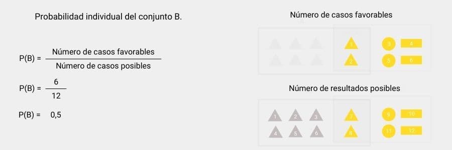 Una vez calculada la probabilidad individual del conjunto A, procedemos a calcular P(B) empleando el mismo método. El número de casos favorables coincide con la cantidad de figuras amarillas, mientras que el número de resultados posibles vuelve a ser la cantidad total de figuras.