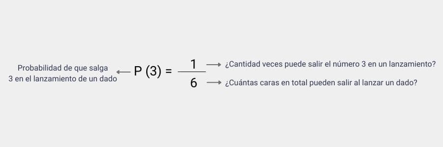 Veamos un ejemplo. ¿Qué probabilidad hay de que si lanzamos un dado obtengamos el número tres en la cara superior del dado? Planteamos la fórmula anterior y calculamos de la siguiente manera: