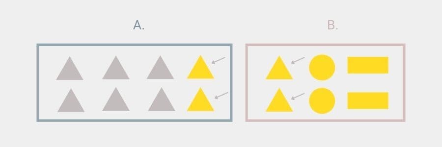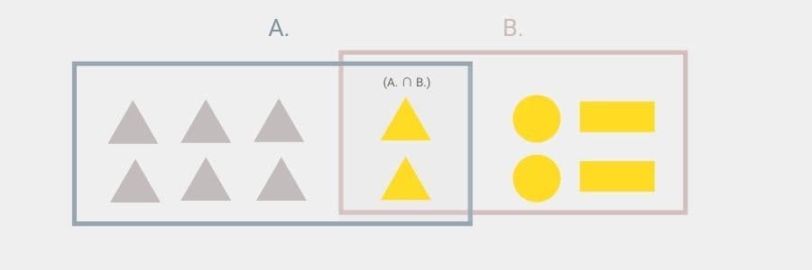 A la izquierda y con un recuadro azul tenemos el conjunto A, el cual engloba todos los triángulos. A la derecha y con un recuadro roza está el conjunto B, que engloba todas las figuras amarillas incluidos los dos triángulos amarillos que también pertenecen a A.