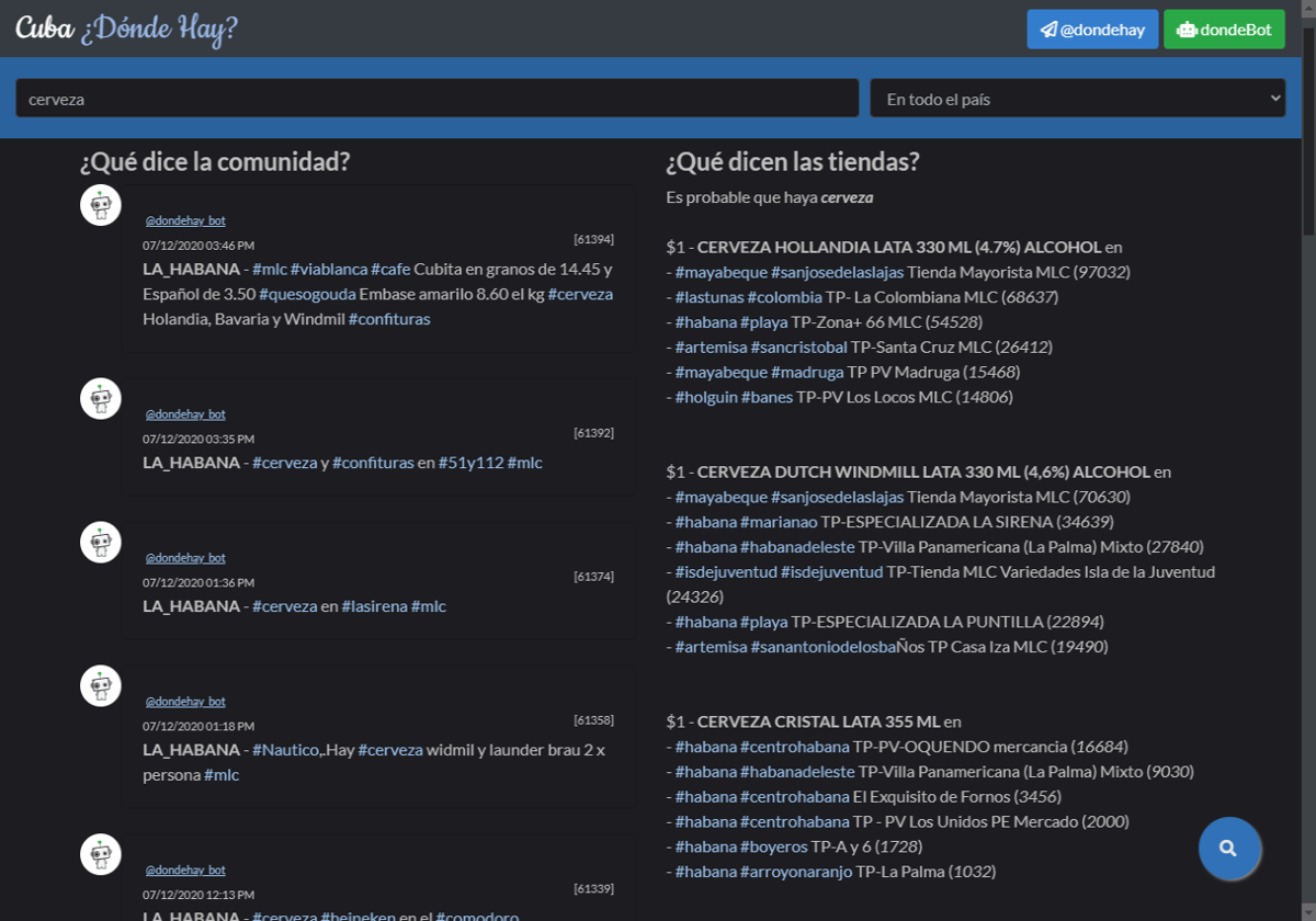 Cuba ¿Dónde Hay? es la alternativa más efectiva cuando se trata de realizar búsquedas en la red de tiendas. Surgió como uno de los grupos en Telegram para encontrar productos, pero luego evolucionó a un sitio web y a un bot —programa informático con el que se interactúa—. Desde esas tres variantes se pueden encontrar productos.
