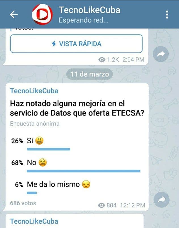 Encuesta sobre el servicio de datos móviles, realizada en Telegram por el equipo de Tecnolike.