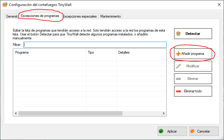 1.5- A continuación, se abre una ventana con varias pestañas. Seleccionamos “Excepciones de programas”. Pulsamos “Añadir Programa”.