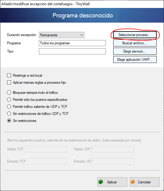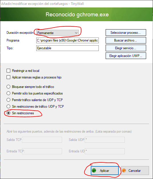 1.8- Establecemos en “Permanente” la duración de la “excepción” y en “Sin restricciones”. Luego damos en “Aplicar”.