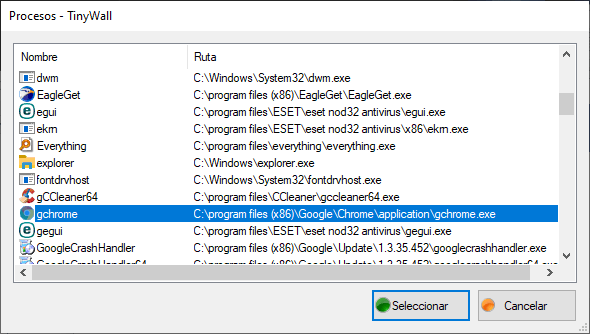 1.7- TinyWall listará todos los procesos ejecutados por los programas activos en ese momento en nuestra PC. Como mantuvimos abierto el navegador, solo es necesario buscar “chrome” dentro de esta lista (o “firefox”, dependiendo de qué navegador usemos) y pulsar “Seleccionar”. Por eso lo dejamos abierto al inicio.