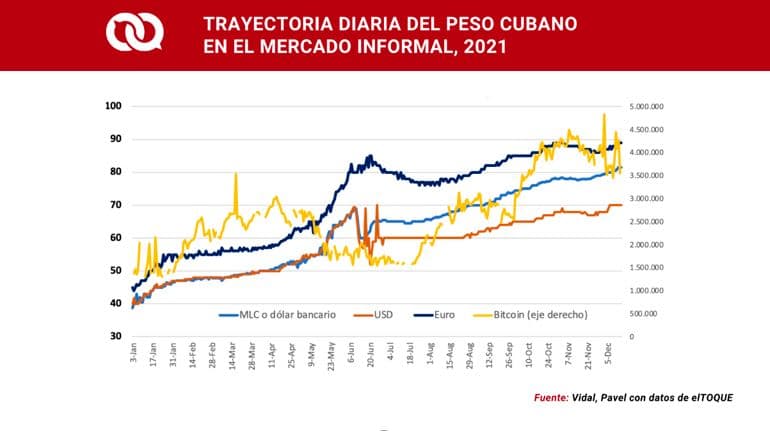Durante 2021, por ejemplo, se distinguió en el mercado informal (según los datos capturados por elTOQUE) que el peso cubano se estuvo depreciando durante la primera mitad del año frente al dólar en operaciones en efectivo, el dólar bancario (MLC), el euro y también el bitcoin. En junio ocurrieron disrupciones en estas tendencias debido a la medida del Banco Central que dispuso que los bancos y las casas de cambio no aceptarían dólares en efectivo. Sin embargo, desde agosto y septiembre, poco a poco, todas las monedas retomaron su tendencia a fortalecerse en relación con el peso cubano, algo que ha continuado y se ha acelerado en los primeros días de 2022. Tales tendencias a la desvalorización del peso cubano en el mercado informal explican gran parte del aumento de los precios en los mercados de consumo.