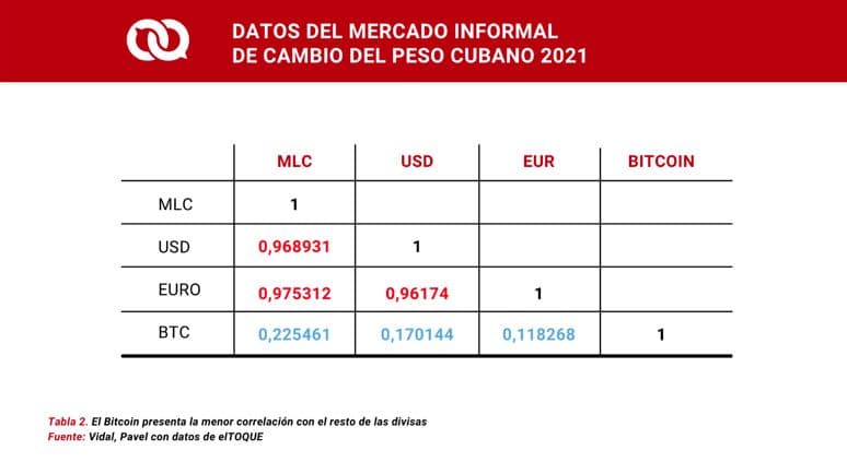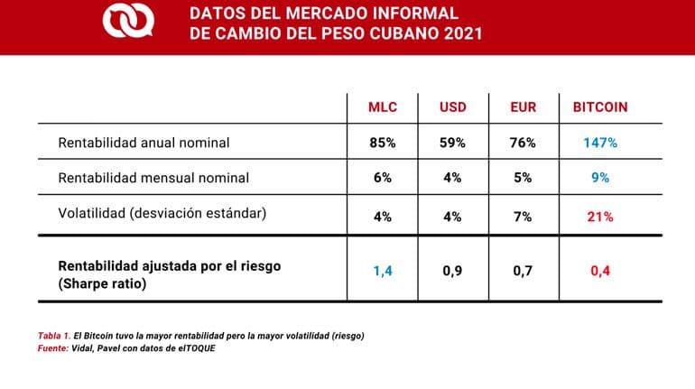 El bitcoin aparece con la mayor rentabilidad en pesos cubanos. En 2021 se valorizó un 147 % en el mercado cubano, lo que equivale a una rentabilidad del 9 % mensual. Le siguen el dólar bancario (MLC), el euro y el dólar físico. Nótese que comprando cualquiera de estas monedas se hubiese logrado solo una protección parcial frente a la inflación, pues se ubicó alrededor del 500 %.