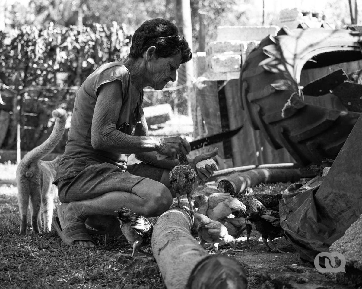 Viderba ama el campo, por eso después de varios años viviendo en La Habana, regresó a Seibabo. En la imagen, alimenta a sus pollos con pedazos de yuca.