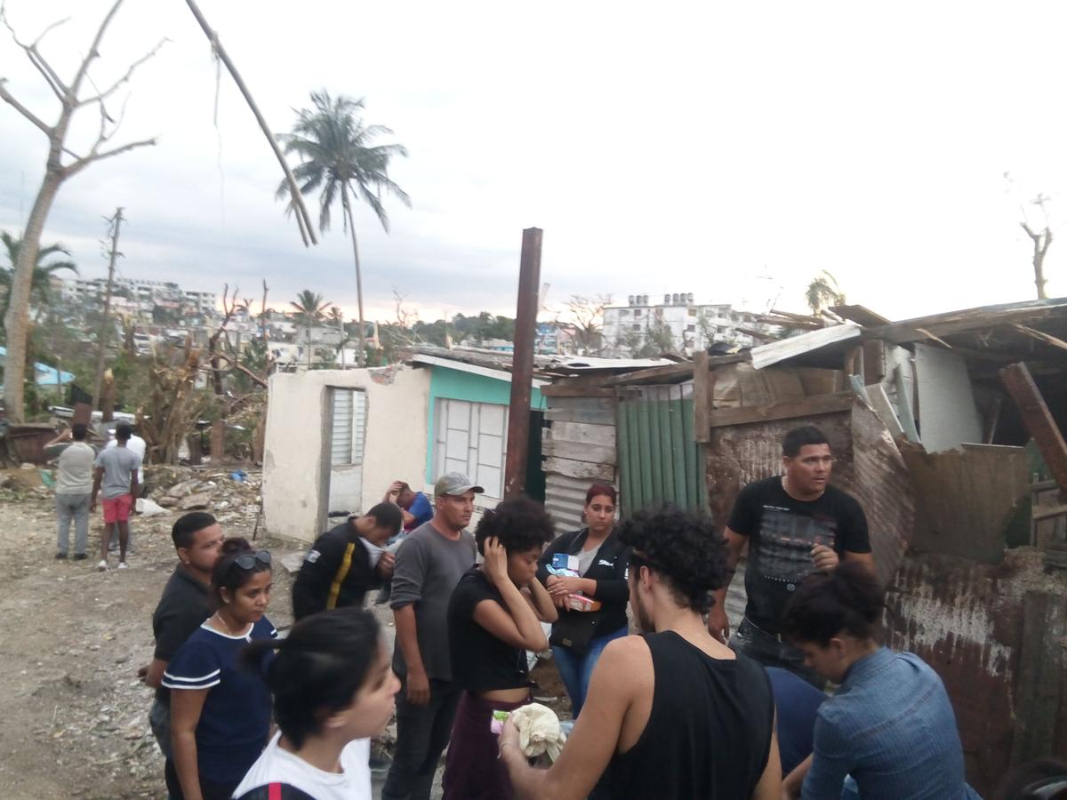 Los delegados indican dónde viven los afectados y salen grandes grupos de estudiantes cargados para repartir cosas. Arriba, en la loma y frente a la iglesia, una mujer se debate entre una multidud: “Solo quiero un par de zapatos para mi esposo, yo no quiero nada”. Los hombres la empujan y no la dejan pasar. La sacan de la cola. Ella no se rinde y va hasta la delegada, que nos llama y explica el caso. Viven en un solar justo al lado de la iglesia. Han logrado acomodar un toldo para sustituir de alguna manera el techo que perdieron. Son casi 30 vecinos.