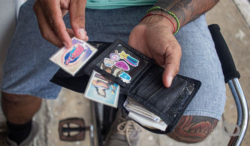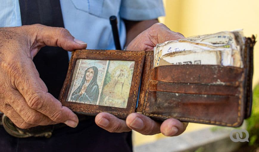 Este fotógrafo estaba haciendo algunos mandados en la calle. En su abultada billetera acumulaba recibos de multas y pagos, una estampa de la Virgen y pegatinas obsequiadas por su hija. Foto: Yaritza Guirado Alejo.