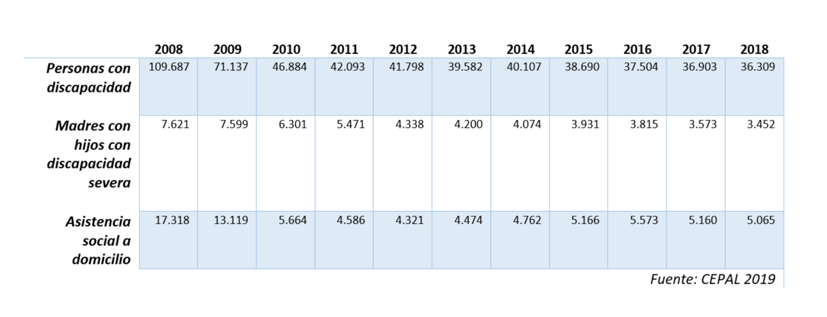 Como se muestra en la tabla siguiente, en los últimos 10 años ha ido disminuyendo progresivamente la ayuda. Si se observan los valores de 2008 y 2018, disminuyó en un 67% la cobertura a personas con discapacidad; el apoyo a madres de hijos con discapacidad severa en un 55% y el programa de asistencia a domicilio en un 70% (Revuelta & Hernández, 2021).