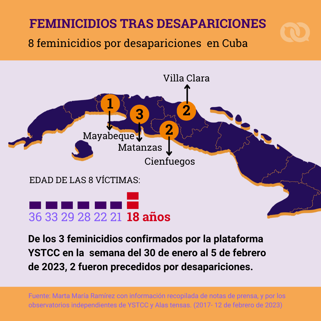 Desde 2017 hasta el cierre de este artículo (lunes, 6 de febrero, 8:00 p. m. de Cuba), organizaciones como la plataforma feminista Yo Sí Te Creo en Cuba documentan ocho feminicidios tras desapariciones: