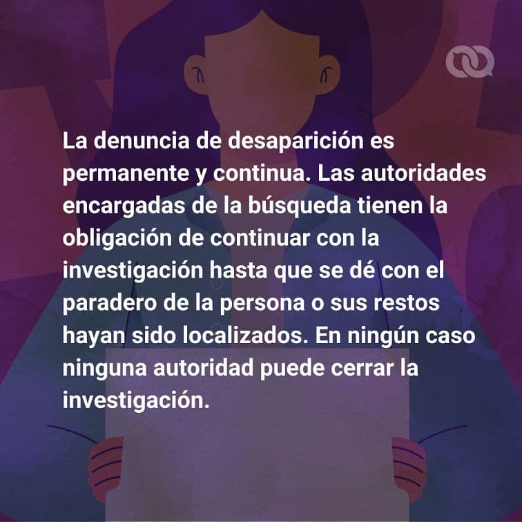 La denuncia de desaparición es permanente y continua. No prescribe, o sea, no caduca su investigación con el paso del tiempo. Las autoridades encargadas de la búsqueda tienen la obligación de continuar con la investigación hasta que se dé con el paradero de la persona o sus restos hayan sido localizados. En ningún caso autoridad alguna puede cerrar la investigación.