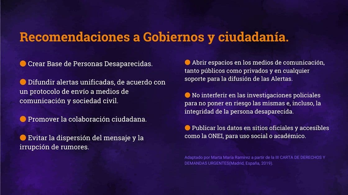 Como he escrito, es imposible sustituir al Estado. Pero es nuestro deber ciudadano ayudar a las familias a buscarlxs, encontrarlxs y presionar a las autoridades insensibles. Con las alertas no solo se quiere la máxima difusión, sino que se fomente la solidaridad ciudadana local e internacional a través de Internet, redes telefónicas y otros medios de comunicación para el objetivo mayor: que aparezcan con vida.