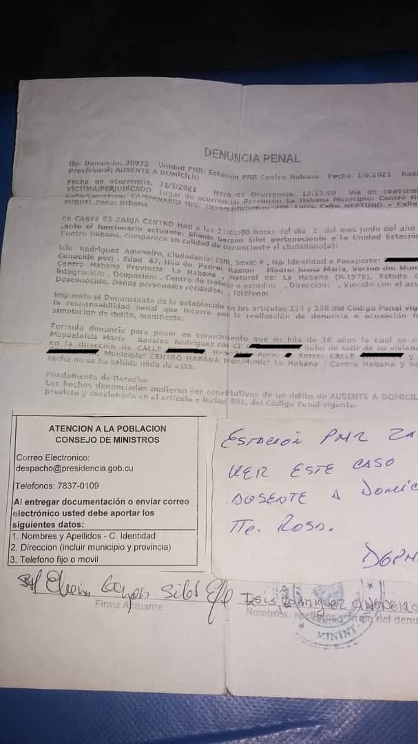 Pero en el acta policial las fechas no coinciden. Se lee: «No. Denuncia: 30932. Unidad PNR: Centro Habana (conocida como Zanja). Fecha: 1/6/2021… Fecha de ocurrencia: 31/5/2021». Otra vez escriben: «Ausente A Domicilio».