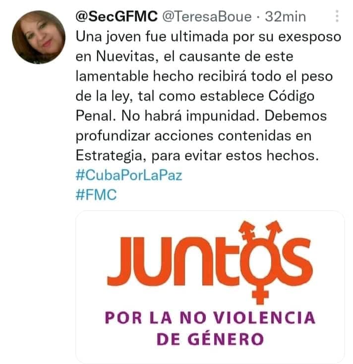 La misma funcionaria, que comete errores graves por revictimizantes y falsos en su publicación, dijo al parlamento unicameral cubano en 2022 sentirse satisfecha con la no tipificación de los feminicidios en el nuevo Código Penal y con que solo el motivo de género fuera considerado un agravante en el asesinato.