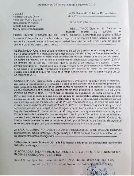 Los jueces, sin haber realizado ninguno de los procedimientos previamente descritos, reconocieron “que no le asiste razón al peticionario” porque Ferrer está siendo procesado en un Expediente de Fase Preparatoria iniciado el 3 de octubre de 2019 y en el que obra un Acta de Detención fechada el día primero del propio mes. Además, reconocieron que la prisión que sufre responde a una Medida Cautelar de Prisión Provisional emitida por un fiscal en fecha 7 de octubre de 2019.
