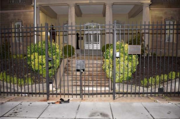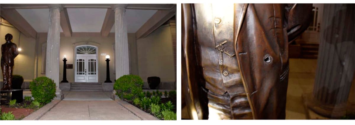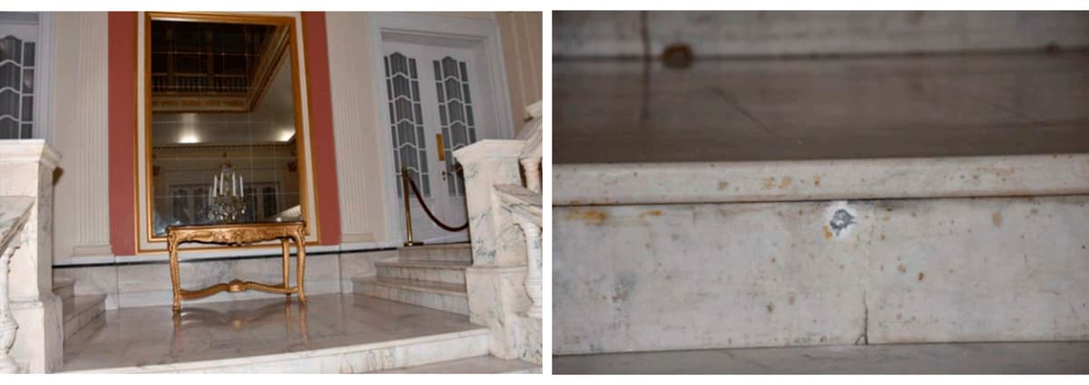 Los técnicos que analizaron la escena del crimen observaron y fotografiaron múltiples impactos en el área de entrada de la Embajada, incluyendo daños aparentes en la valla exterior, el asta de la bandera, la estatua, las columnas, una ventana de vidrio exterior y la puerta principal. También detectaron daños aparentes en el interior, específicamente en el área del vestíbulo principal, incluyendo las escaleras, paredes y techo.