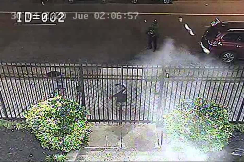 Momento en el que Alazo dispara contra la sede diplomática. Captura de pantalla del video de vigilancia. Tomada de los documentos judiciales.