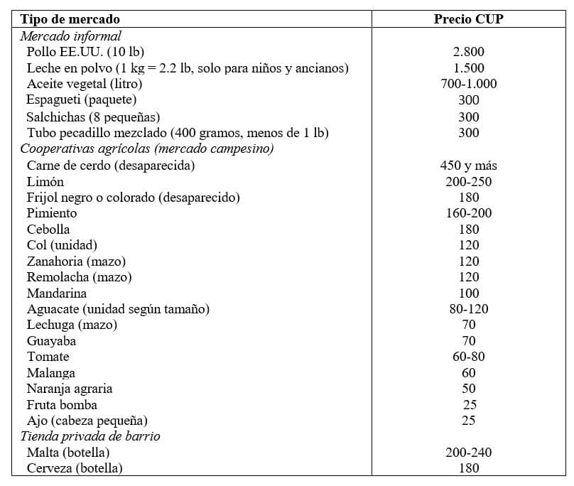 El Cuadro 1 muestra el precio en CUP de los alimentos en varios mercados de La Habana a inicios de diciembre de 2022. Los precios fuera de la capital son más altos.