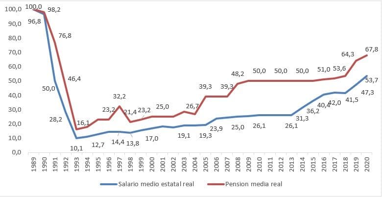 Gráfico 2. Valor del Salario Estatal y la Pensión Media Real, en 1989-2020 (Índice 1989=100)