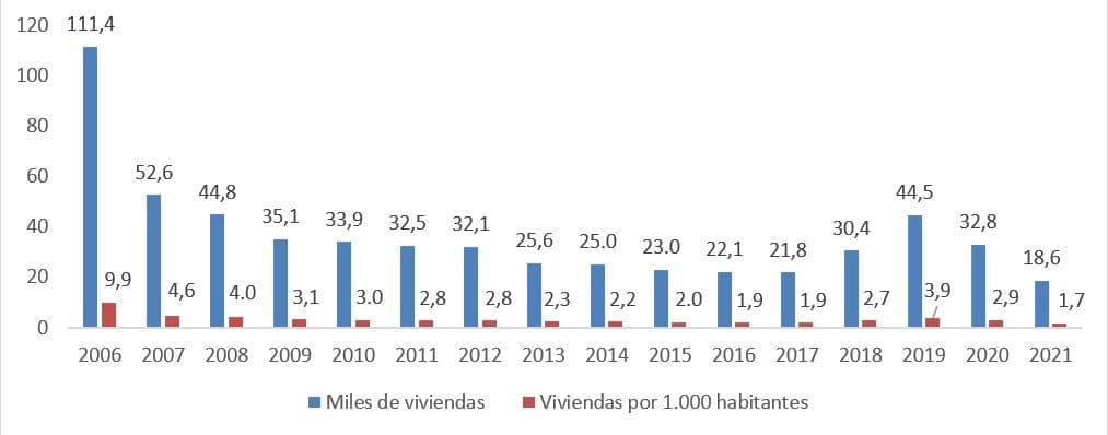 El número de viviendas construidas en Cuba decreció un 83 % entre 2006 y 2021 (de 111 400 en 2006 a 18 600 en 2021), salvo un repunte en 2018-2019; en relación con mil habitantes, la caída fue de 9.9 a 1.7 en igual período (Gráfico 4).