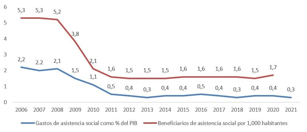La ONEI nunca ha publicado cifras sobre la incidencia de la pobreza, aunque lo hagan los países latinoamericanos y caribeños. Aun así, el análisis anterior indica que la pobreza en Cuba debe haber aumentado de manera sustancial (Mesa-Lago y Svejnar, 2020; Mesa-Lago, 2021). Por ello, la asistencia social para proteger a la población vulnerable debió expandirse, pero en la realidad disminuyó entre 2006 y 2021 de 5.3 a 1.7 beneficiarios por mil habitantes y de 2.3 % a 0.4 % del PIB (Gráfico 5).