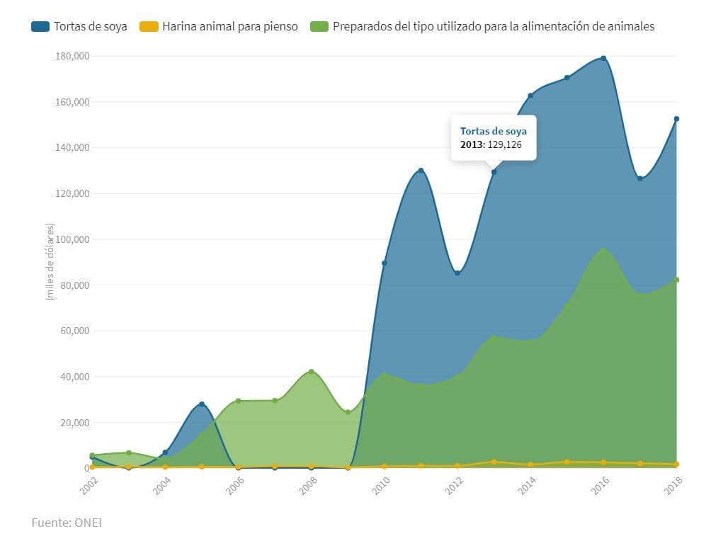Al cierre de 2018 Cuba había invertido más de 152 millones de dólares en la compra de tortas de soya, 82 millones para preparados y casi dos millones en harina animal para pienso. Estos no son los únicos gastos que se hacen en alimento animal. El maíz importado, aunque no aparece desagregado en las estadísticas de la ONEI, también se destina para el consumo humano y para la producción de piensos dedicados al ganado vacuno, bovino, porcino y la cría de pollos.