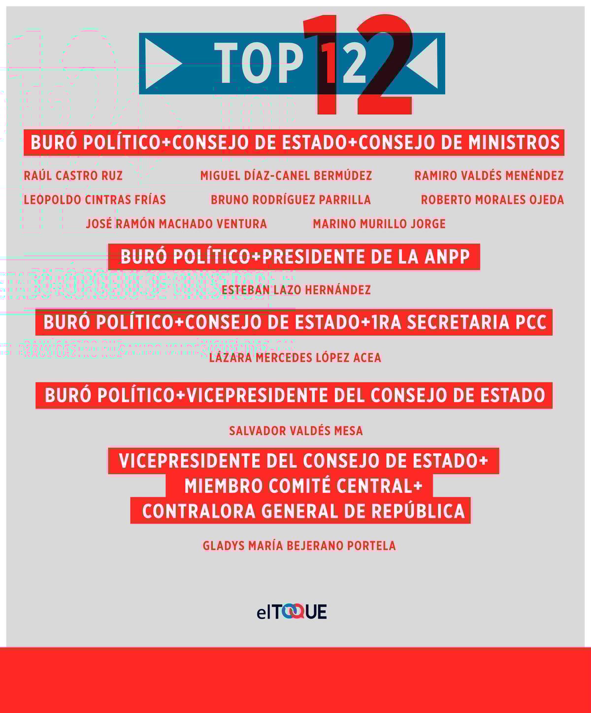 * Posterior a la publicación de este trabajo pudimos confirmar que el único miembro del Consejo de Ministros no incluido en nuestro conteo inicial (el presidente del Instituto Cubano de Radio y Televisión, ICRT) sí está entre los nominados/electos. Se trata de Alfonso Noya, quien sustituyó a Danylo Sirio en octubre de 2016. Por tanto, los 27 miembros del Consejo de Ministros también repiten en esta Asamblea.