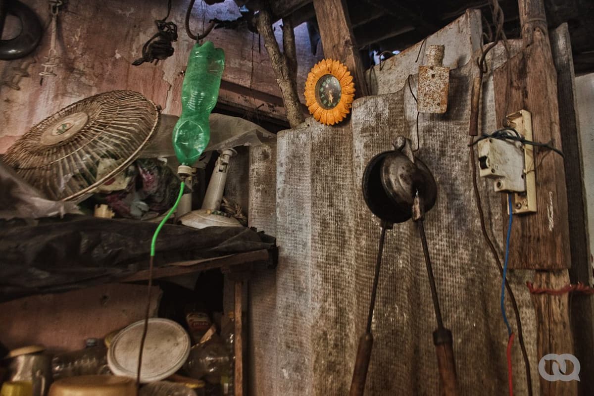 Sus quince ventiladores han sido armados y reciclados por él, aunque casi ninguno funciona. Rollos de cables, bultos de tornillos y tuercas acumulados en los rincones: todo recalentado por igual bajo el techo de fibrocemento y zinc que le dieron después de un ciclón. «Esta casa hubiera sido vendida junto con la suya, y habrían logrado llevarse más dinero», se queja.