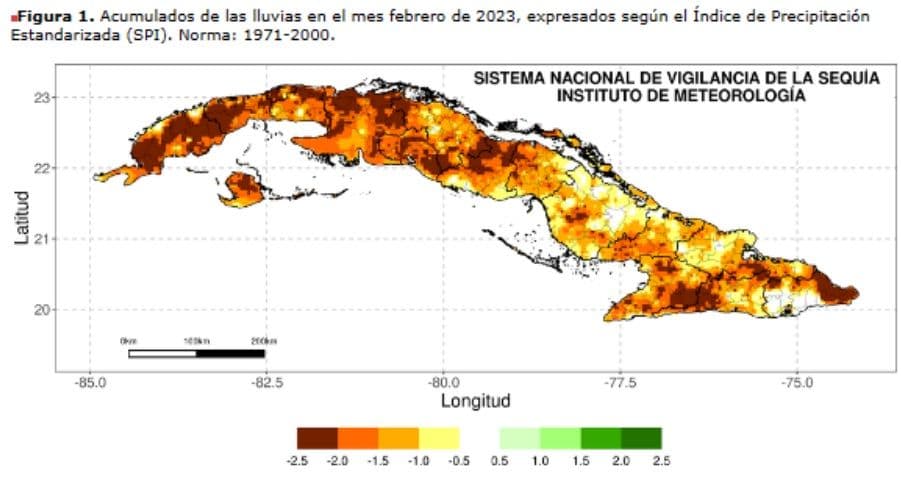 According to the weather institute (INSMET), February 2023 ended with “94% of the country with a deficit in accumulated precipitation. Out of the country’s 168 municipalities, 145 recorded a moderate to extreme deficit in over 25% of its regions. Out of those, 130 had over 50%, 112 with over 75% and 58% with 100% of their areas affected.”