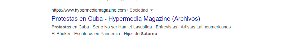 Este enlace del medio digital Hypermedia Magazine pertenece a la sección «Protestas en Cuba», con lo cual los buscadores le otorgan cierta relevancia a la palabra protesta. Dentro de su código fuente se encuentra seis veces la palabra saturno como parte de un enlace al artículo «Hijos de Saturno».