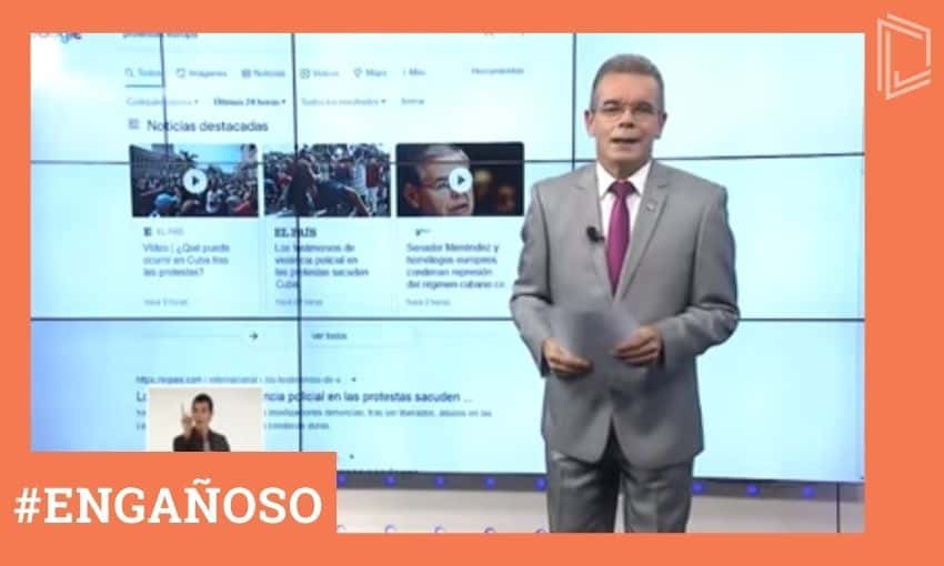 En la emisión del Noticiero Nacional de Televisión (NTV) del 22 de julio, el presentador Froilán Arencibia utilizó ejemplos de los resultados de búsqueda en Google para justificar la existencia de una campaña de desestabilización contra Cuba por parte de la empresa tecnológica. Sus afirmaciones son ENGAÑOSAS.