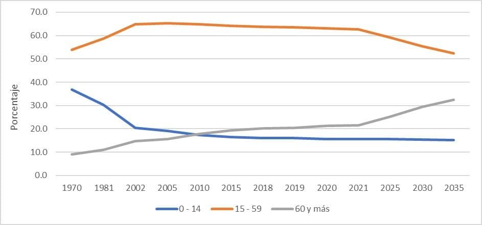 Según el Anuario Estadístico de Cuba de 2020, persiste el aumento en el porciento de adultos mayores en contraste con la disminución de la población en edad laboral (entre los 15 y los 59 años). La tendencia debe ser más acentuada hacia 2035, cuando se estima que las personas de la tercera edad representarán el 32.5 % del total de la población.