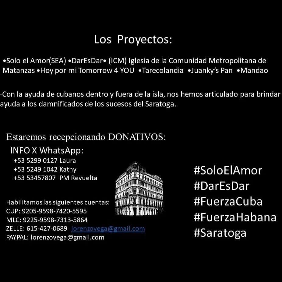 La comunidad cubana en el extranjero también se movilizó tras la explosión en el Saratoga. Como sucedió durante otros eventos (tornado de 2018, crisis sanitaria por la COVID-19 entre 2020-2021), las personas se han organizado a través de Facebook para recaudar dinero, medicamentos, ropas y otros artículos.