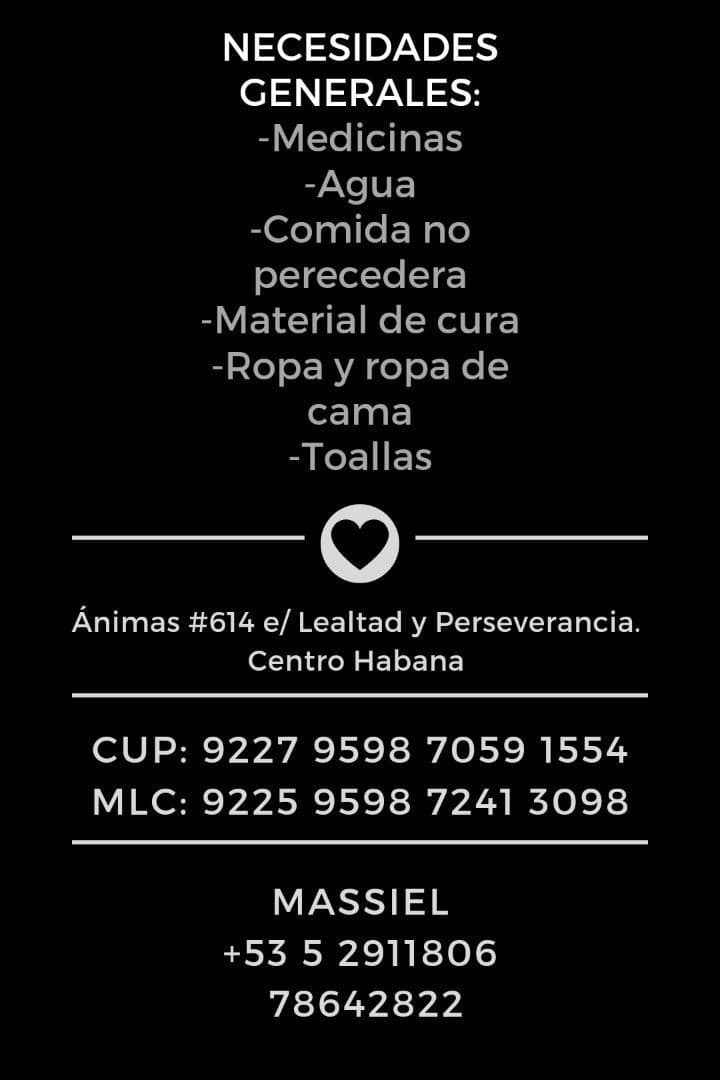 Una de las primeras iniciativas fue la de Massy Carram en Facebook. La usuaria habilitó, desde la noche del 6 de mayo y hasta el próximo miércoles 11, un punto de recogida en Ánimas No. 614 entre Lealtad y Perseverancia, Centro Habana. Además, puso a disposición dos tarjetas bancarias, una en moneda nacional y otra en MLC, para quien desee donar por esta vía.