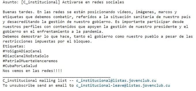 Desde el 11 de julio las autoridades dieron la instrucción a todo «cibercombatiente» de emplear las etiquetas #LaCallesEsDeLosRevolucionarios, #MiMoncadaHoy, #VictoriaPopular y #PonleCorazón, cuenta M.