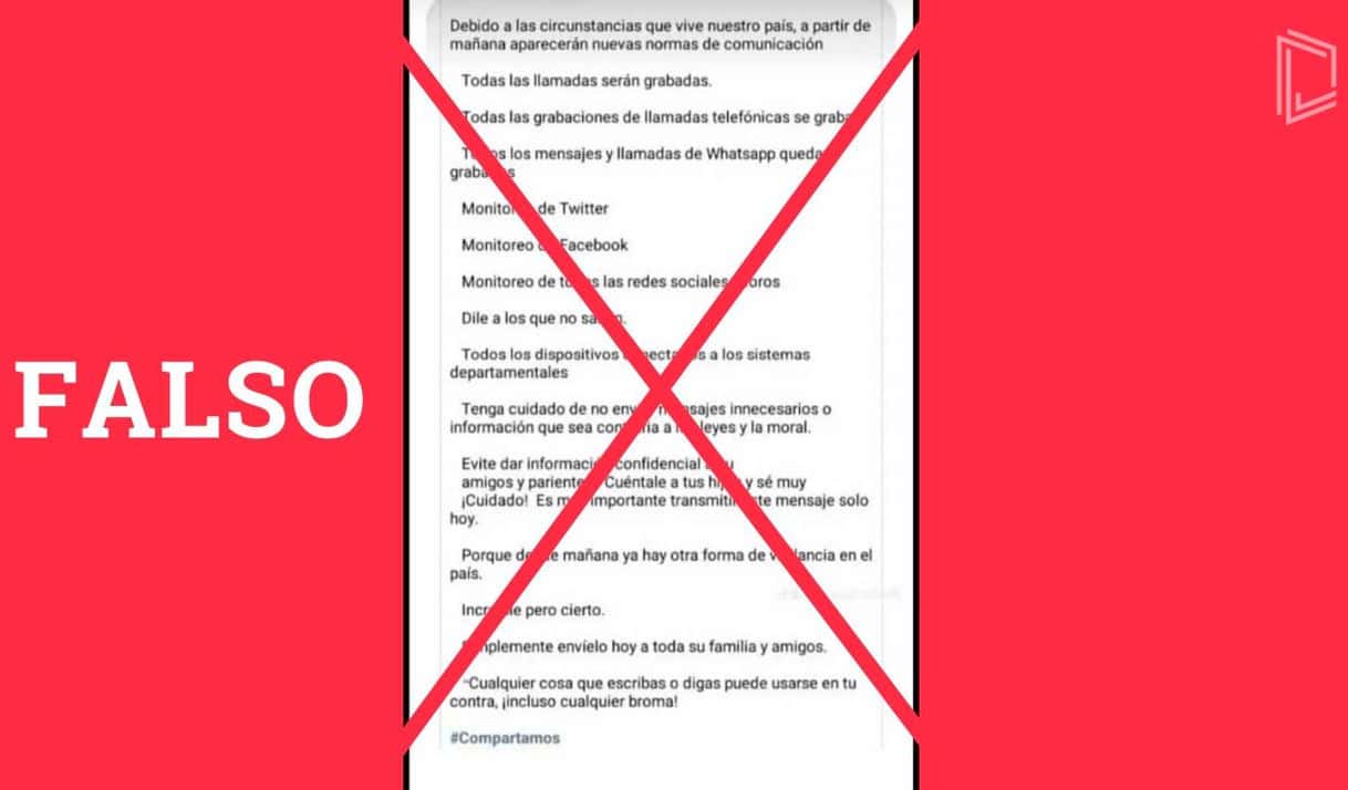 En el mensaje se lee el texto: «debido a las circunstancias que vive nuestro país, a partir de mañana aparecerán nuevas normas de comunicación, todas las llamadas serán grabadas, todas las llamadas telefónicas se graban, todos los mensajes y llamadas de WhatsApp quedan grabados, monitoreo de Twitter, monitoreo de Facebook, monitoreo de todas las redes sociales y foro».