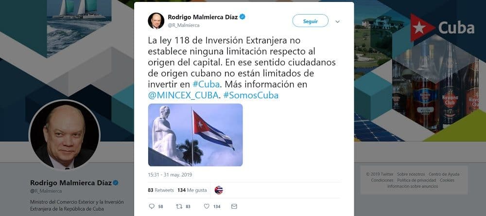 En su post, el funcionario afirmaba que la Ley 118 (Ley de Inversión Extranjera) no establece limitaciones con relación al origen de los capitales, ni de los inversores, para aceptar propuestas de negocios en Cuba.