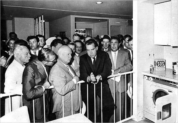 Nixon y Jruschev caminaban por la exposición seguidos por un ejército de periodistas, hablando sobre sus respectivos sistemas económicos y políticos. El soviético repetía que su país se concentraba en “cosas que realmente importan” y no en aparatos “superfluos”. Nixon le replicaba que esas casas costaban 14 mil dólares en su país y estaban diseñadas para hacerle la vida más fácil a la mujer, mientras su oponente replicaba “nosotros no tenemos esa actitud capitalista con las mujeres”. El primero lo provocaba diciendo que sería mejor competir con lavadoras que con cohetes y era respondido “sí, pero tus generales dicen que debemos competir con cohetes. Y somos más fuertes y acabaremos venciendo”.