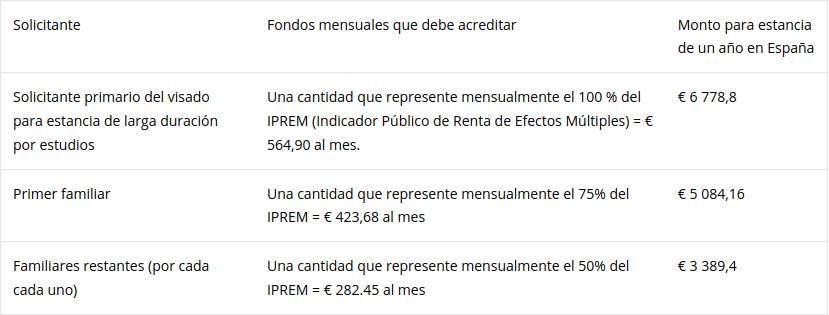 De acuerdo con lo indicado en el sitio web del Consulado de España en La Habana, el estudiante debe demostrar que mensualmente podrá disponer de fondos que representen no menos del 100 % del Indicador Público de Renta de Efectos Múltiples (IPREM). Este indicador es una suerte de referencia de cuáles son los gastos indispensables de una persona al mes. De esta forma, el solicitante de visado debe demostrar que no será una carga para el Estado español una vez que comience sus estudios. Un estudiante, que viaje solo y no con su familia, deberá presentar fondos por no menos de € 6778,8 para una estancia de un año. Si viaja con cónyuge y un hijo, la cifra asciende a € 15252,36. El monto a presentar no se reduce en caso de que el acompañante sea menor de edad: una pareja sin hijos y un adulto solo con un niño deberán presentar exactamente la misma cantidad: € 11862,96. La siguiente tabla lo resume:
