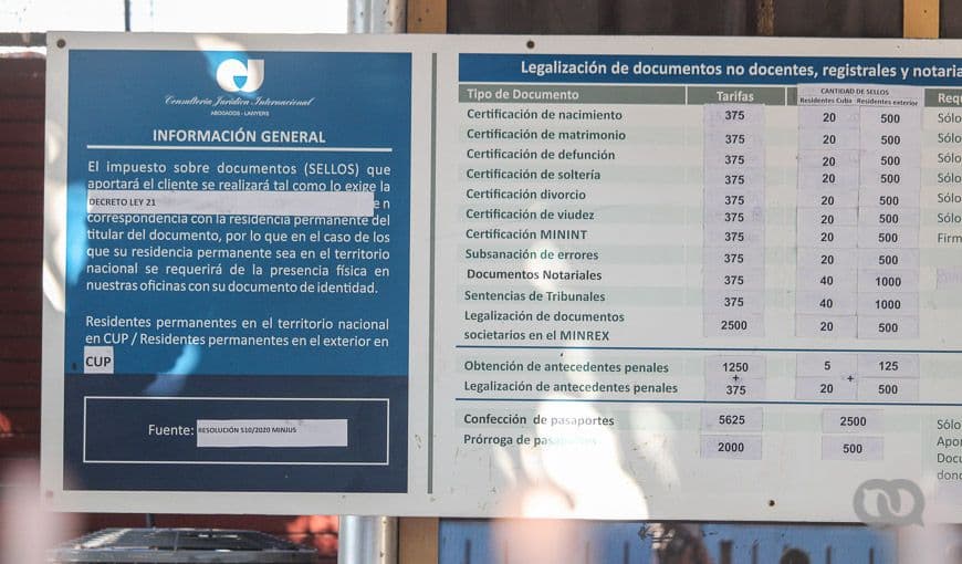 Desde la puesta en vigor de la Tarea Ordenamiento, los precios de los servicios de legalización se llevaron a CUP. La Resolución 48/2021 contenida en la Gaceta Oficial No. 17 Ordinaria del 15 de febrero de 2021 tiene el listado actualizado de los precios de cada servicio. Además, cada documento requiere sellos, los cuales usualmente no se pueden adquirir en el lugar donde se ofrece el servicio. Por tanto, antes de hacer la cola, infórmate bien de cuántos sellos debes llevar para cada legalización, y haz los cálculos para asegurarte de que llevas contigo todo el dinero en efectivo que necesitas.