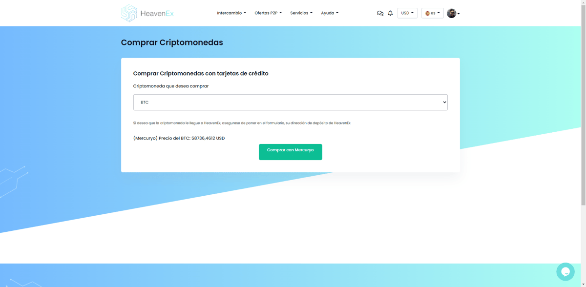 HeavenEx también permite comprar criptomonedas como el bitcoin (BTC), el ethereum (ETH) y el tron (TRX) con tarjetas internacionales. La compra se hace a través de Mercuryo, un empresa financiera británica que ha trabajado con negocios como Binance, Kucoin y Trust Wallet.